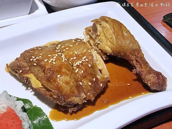 因為還有淋醬汁,所以我一度以為它是滷雞腿,實際上是炸的。雞腿看起來很入味,很香。