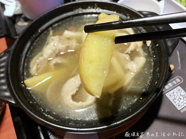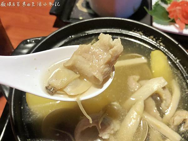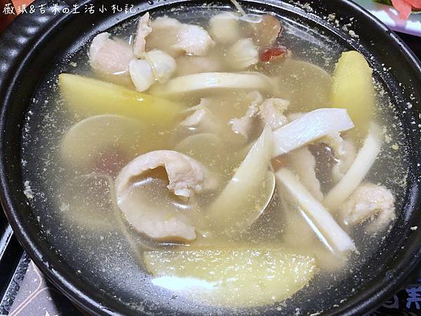 整碗湯裡,有滿滿的松阪豬肉、蘋果片跟蛤蠣,除此之外還有幾種菇切片、紅棗,營養得很啊!